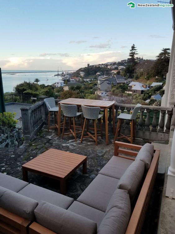 The main living space has views of the Tasman Bay and the Port Hills. Step out onto the main upstairs patio where you can relax on the lounge or at the bar table. These areas are shared by all guests and provide a great place to relax at the end of a day of sightseeing.